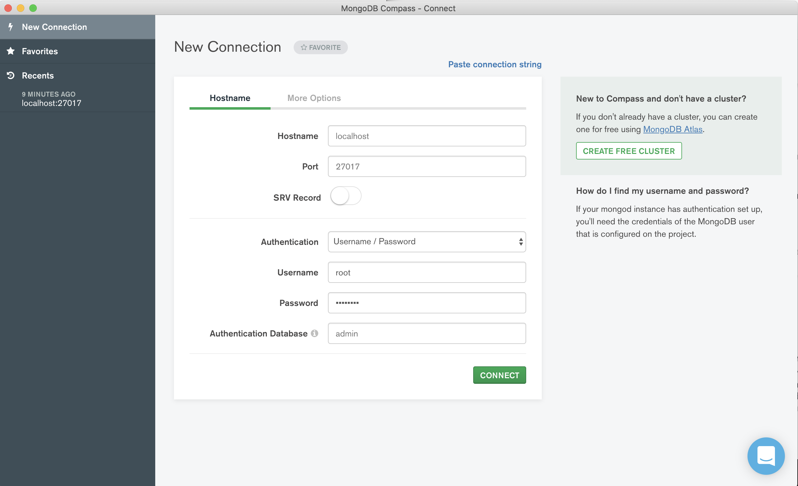 아까 만든 계정 이름과 비밀번호 입력해주고 Connect 시키면 끝