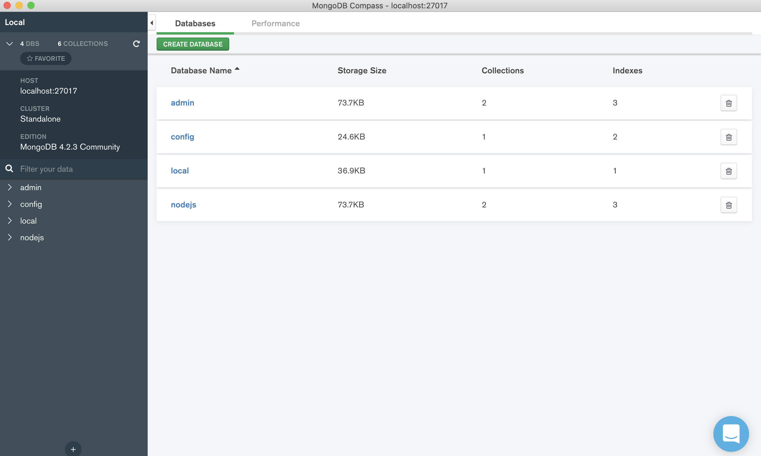 간단하게 nodejs라는 데이터베이스를 만들어봅니다.