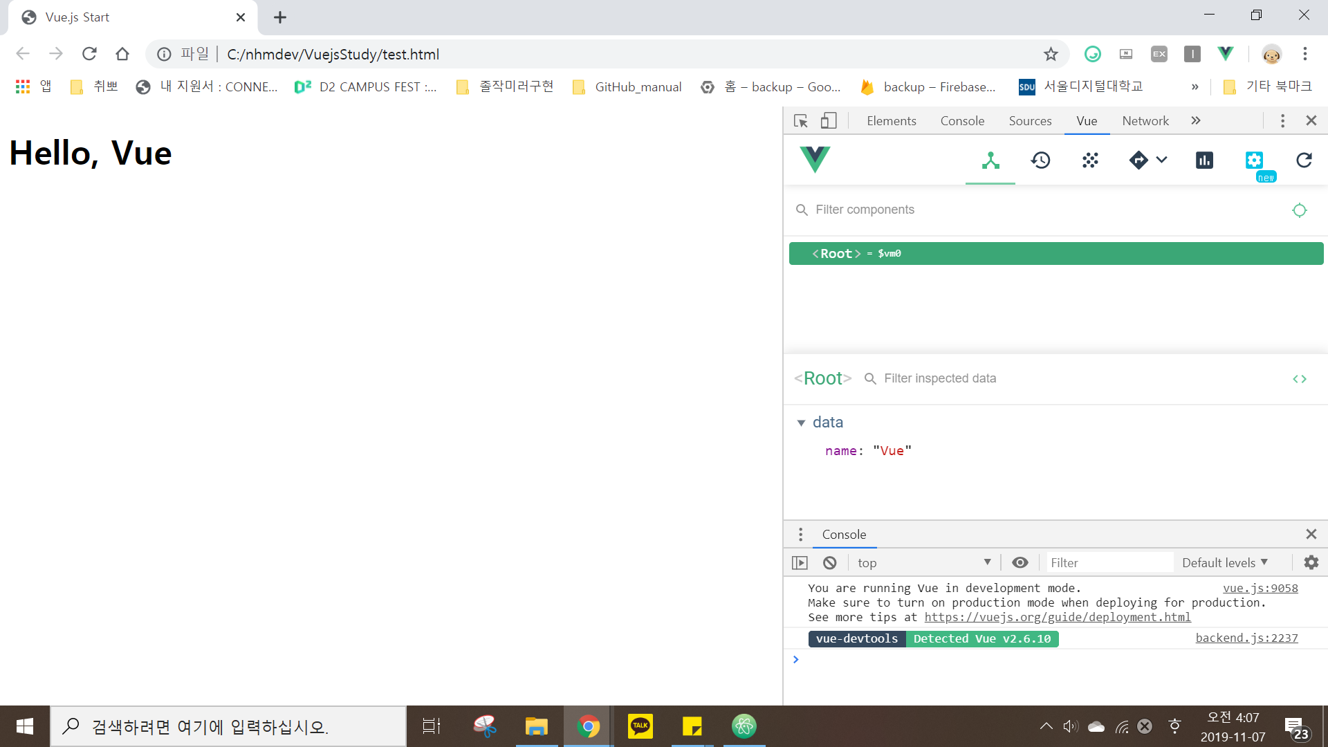 실행하면 위와 같이 Hello, Vue가 출력되는 걸 확인할 수 있습니다.