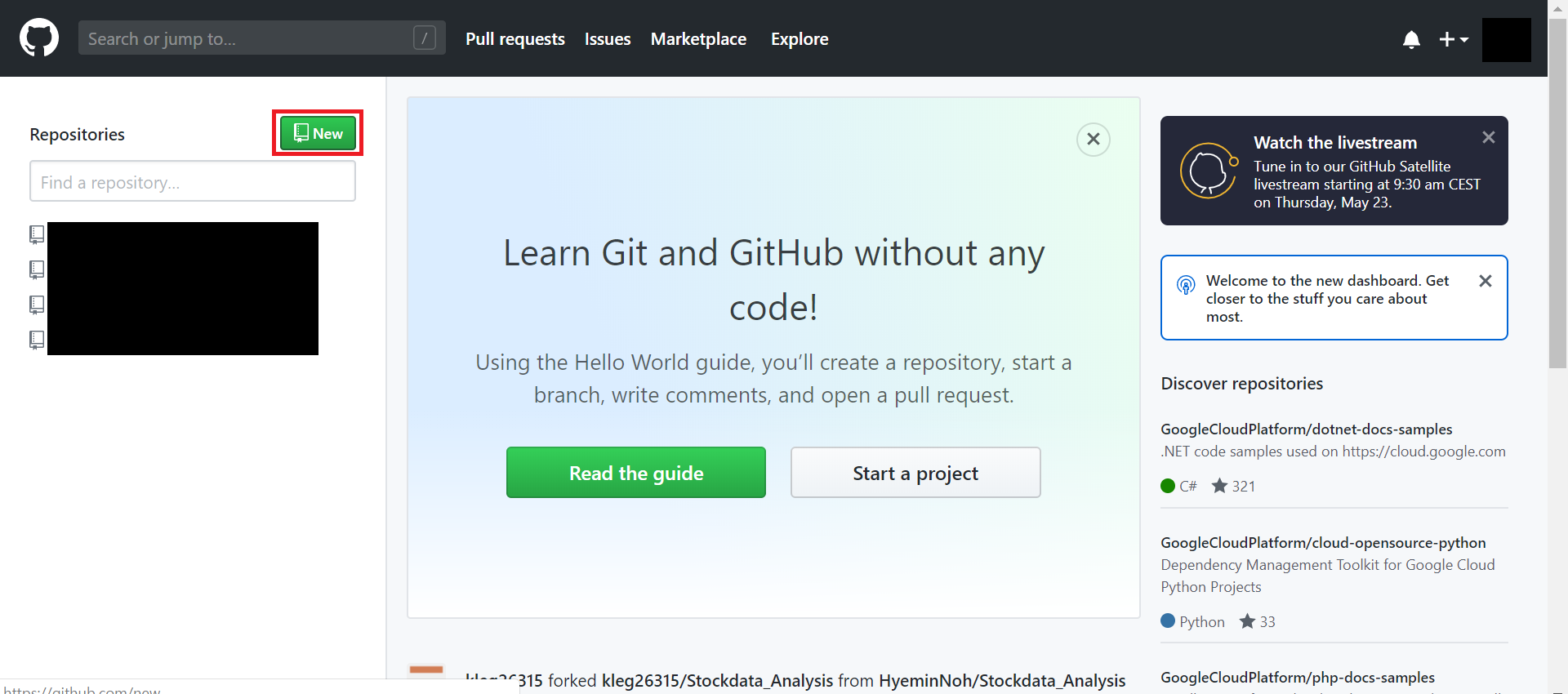 4. github.com으로 다시 돌아가 초록색 책 아이콘을 클릭해 새로운 저장소(repository)를 생성한다.